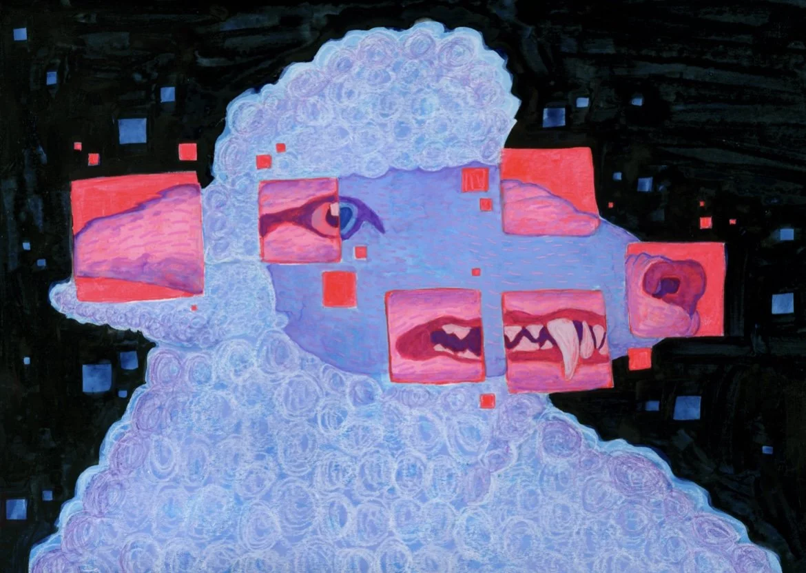My painting, Wolf in Sheeps Clothing, is a “sheep” but it’s true form can’t be contained. The wolf. His sheep disguise is starting to glitch away because you can’t hide your true intentions forever. Trying to pass as a soft blue sheep, the wolf’s teeth are exposed the vibrant red and purple squares, showing its true violent nature. I made this piece with gouache paint and wax pastel on a mixed media paper.